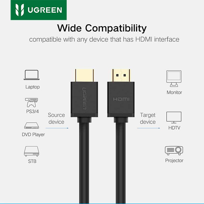 Kabel UGREEN HDMI 2.0 ke HDMI dengan Ethernet menyediakan solusi satu kabel untuk banyak kebutuhan hiburan rumah Anda. Ini dapat diterapkan untuk menyambungkan HDTV Anda ke Pemutar Blu-Ray, Televisi 3D, Roku, Boxee, Xbox360, PS3, Apple TV, Pemutar Streaming, Kotak Kabel HD, PC, atau perangkat HD apa pun dengan output HDMI. Kemudian Anda dapat menikmati audio dan video berkualitas tinggi dari rumah Anda.
