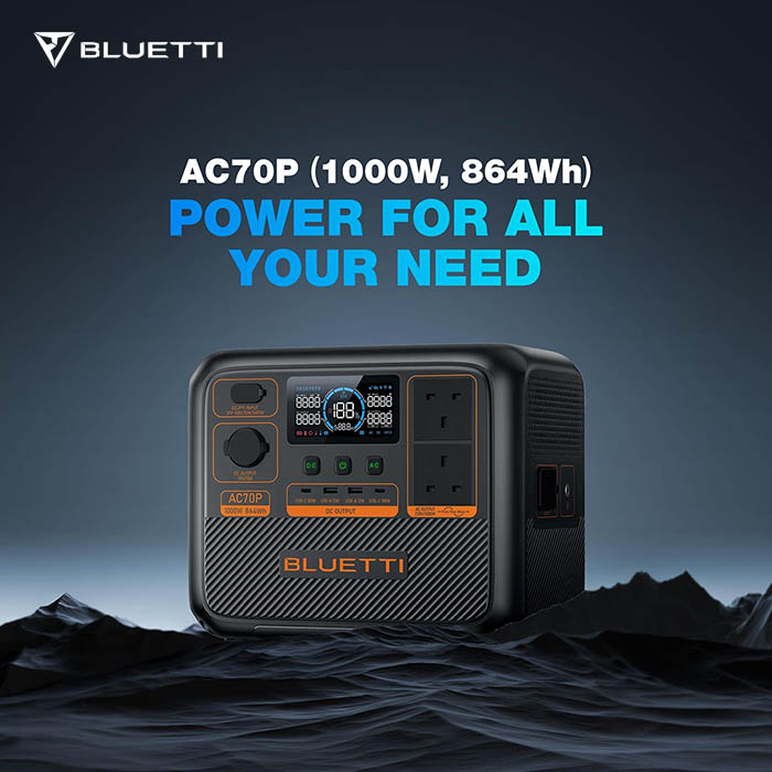 Tingkatkan solusi daya saat bepergian dengan BLUETTI AC70P Power Station! Dengan kapasitas 864 Wh yang tangguh dan daya kontinu 1.000 W, perangkat ini dengan mudah memberi daya pada perangkat penting Anda selama petualangan luar ruangan, petualangan RV, atau saat-saat nyaman di rumah