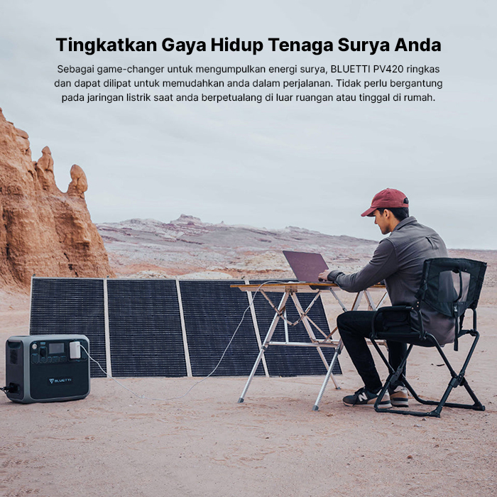 Dengan panel surya PV420 berdaya tinggi yang terhubung, Anda dapat mengisi daya baterai Anda dengan energi surya dengan kecepatan tinggi, memenuhi kebutuhan daya Anda sekaligus menghemat tagihan dalam jangka panjang. Sebagai game-changer untuk mengumpulkan energi surya, BLUETTI PV420 ringkas dan dapat dilipat untuk memudahkan anda dalam perjalanan. Tidak perlu bergantung pada jaringan listrik saat anda berpetualang di luar ruangan atau tinggal di rumah.