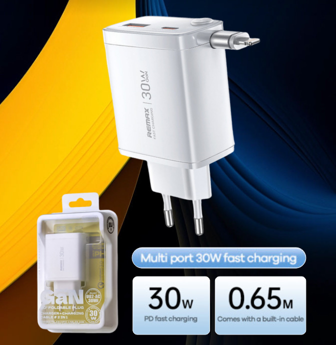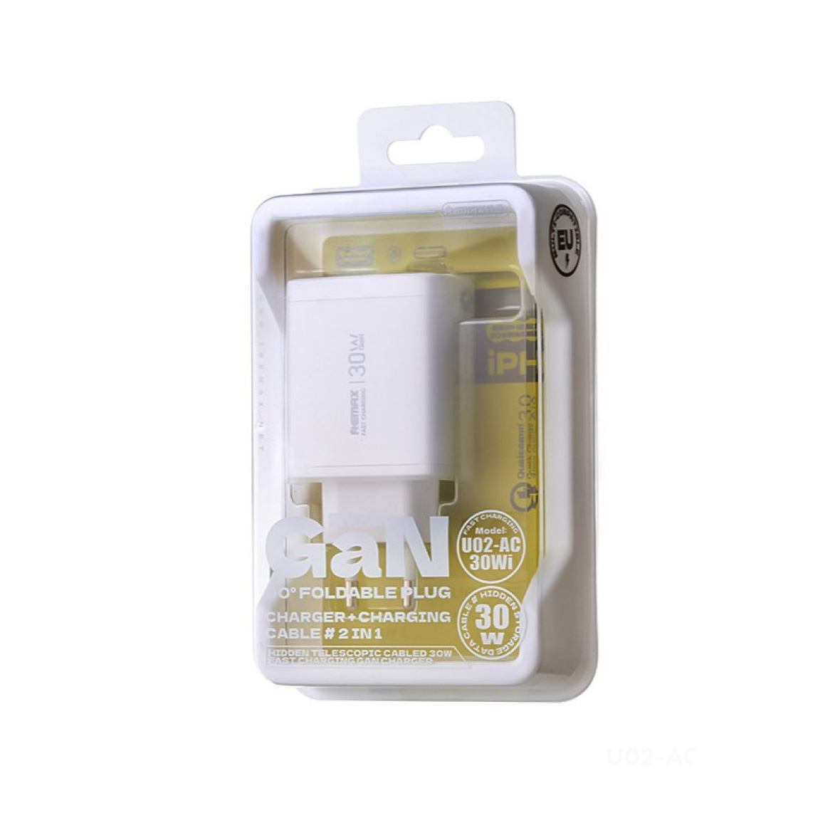 REMAX CHARGER WITH CABLE IPHONE DUAL PORT A+C 30W GAN U02-AC30Wi-WH WHITE