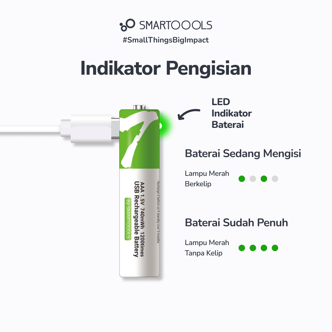 Smartoools Powerbatt adalah baterai isi ulang (rechargeable) berjenis AAA yang memiliki keunggulan tegangan output 1.5V yang stabil (Lithium) dan port pengisian daya USB Type-C terintegrasi. Berkat tegangan 1.5V yang konstan, baterai ini menjamin perangkat elektronik sensitif beroperasi pada kinerja maksimal hingga daya habis. Pengisiannya sangat mudah dan praktis; cukup gunakan kabel USB-C standar tanpa perlu alat *charger* baterai terpisah. Ini adalah solusi daya modern yang bertenaga, hemat, dan nyaman.