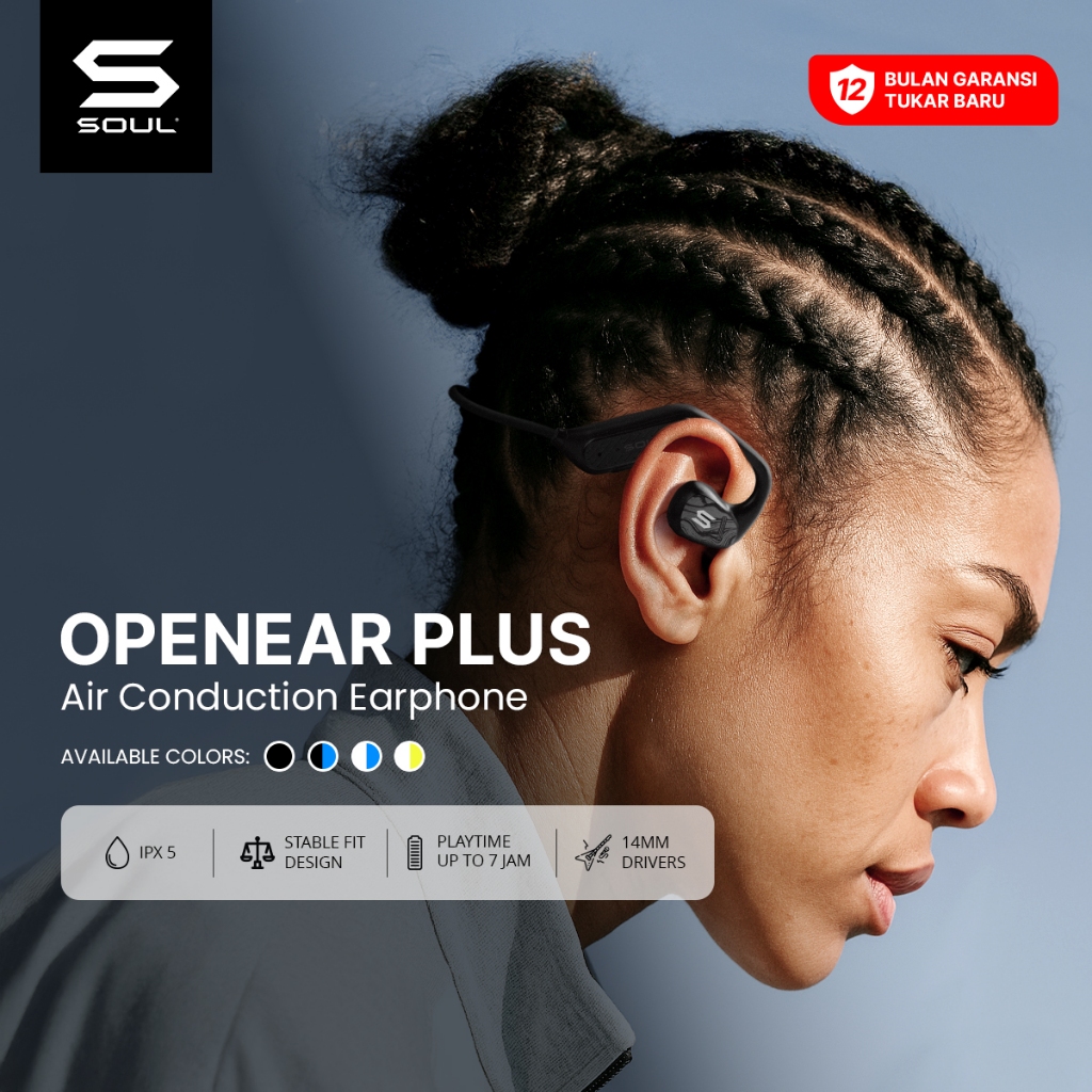 Soul OpenEar Plus menggunakan teknologi open-ear agar Anda tetap waspada dengan lingkungan sekitar saat mendengarkan musik. Sangat aman untuk aktivitas outdoor seperti lari atau bersepeda karena tidak menutup lubang telinga secara total. Desainnya yang ringan dan ergonomis menjadikannya pilihan tepat untuk gaya hidup aktif.