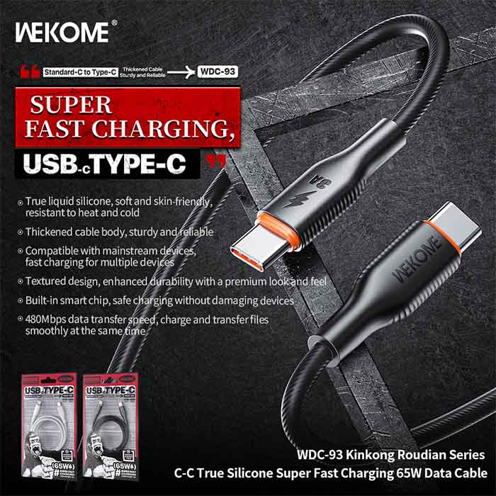 WEKOME WDC-93 King Kong Series adalah kabel data legendaris yang dikenal dengan ketahanan fisiknya yang luar biasa. Kabel Type-C to Type-C ini mendukung pengisian daya cepat Power Delivery (PD) hingga 65W, membuatnya sanggup mengisi daya Laptop, MacBook, hingga smartphone flagship dengan aman dan stabil. Dibalut material Zinc Alloy pada kepala konektor dan lapisan kabel yang tebal, WDC-93 adalah pilihan tepat bagi Anda yang bosan dengan kabel yang mudah putus atau rusak.